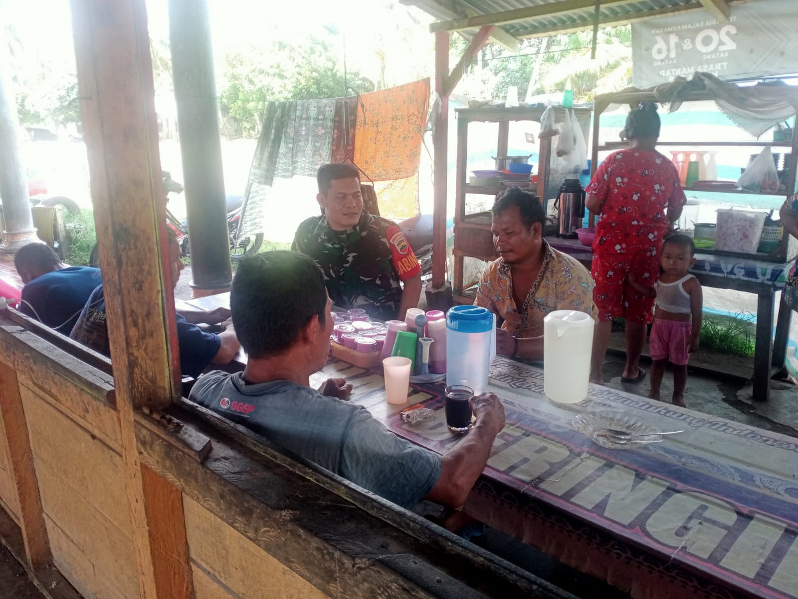 Sertu Patar Giat Simbolon sedang melaksanakan Komunikasi sosial(Komsos)bersama masyarakat Di desa barambang kecamatan Sosorgadong di warung milik ibu Siska Manurung di Desa Barambang Kecamatan Sosorgadong Kabupaten Tapanuli Tengah.