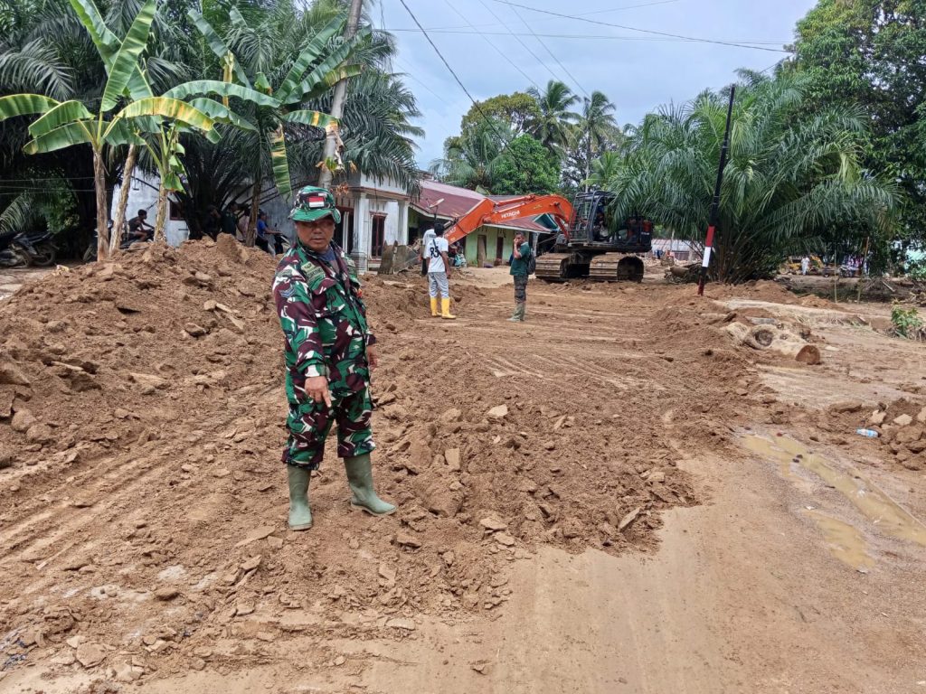 Menyikapi kondisi tersebut, personel TNI dari Koramil 04/Pinqngsori Kodim 0211/TT bergerak cepat memberikan dukungan di lapangan guna membantu percepatan penanganan pasca bencana.