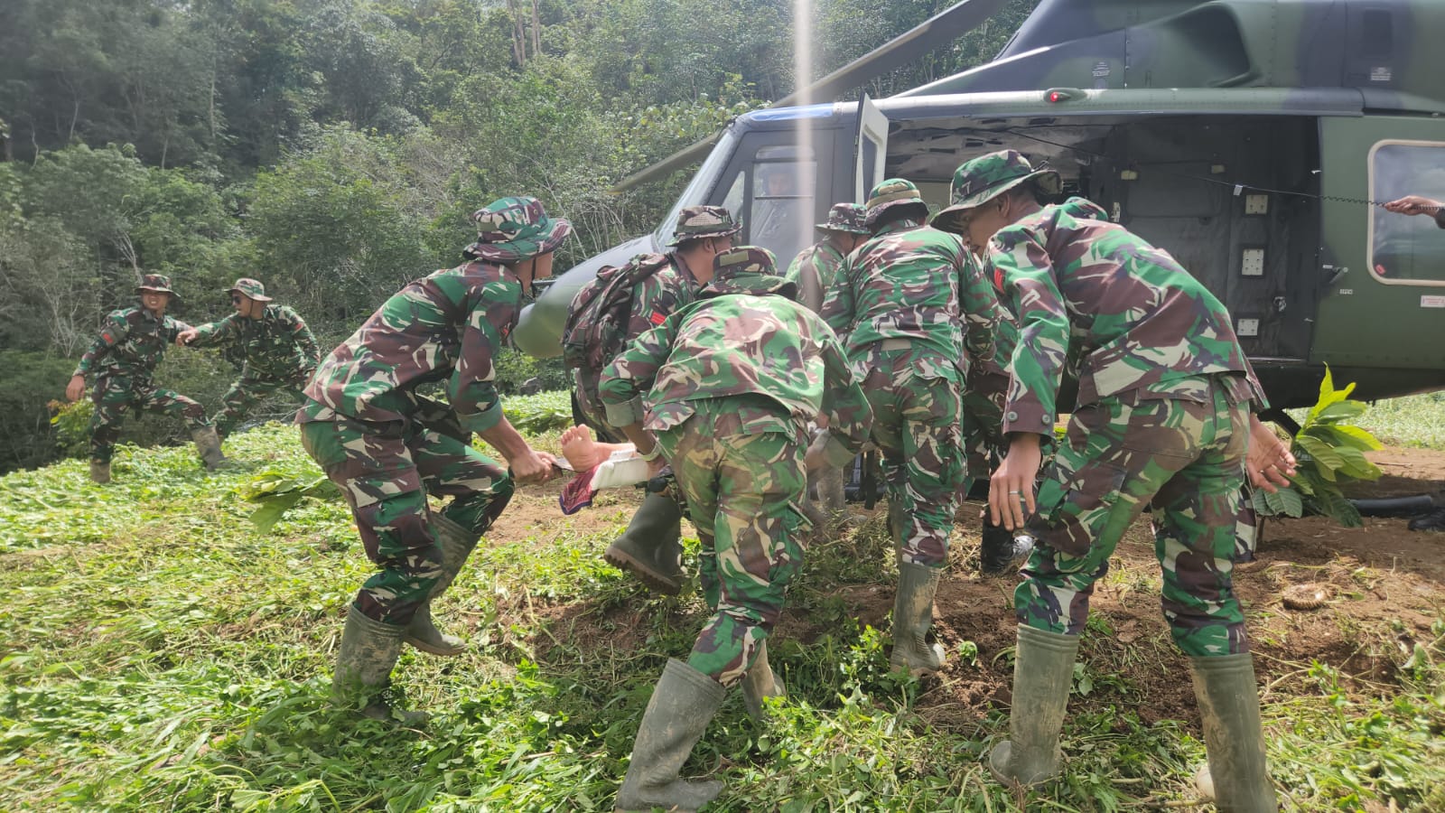 “Sebelum di evakuasi menggunakan hely, warga yang sakit terlebih dahulu diberikan pertolongan pertama, prajurit TNI membuat Tandu untuk membawa warga yang sakit menuju helyped. medan yang dilalui merupakan perbukitan terjal dan licin, akan tetapi tidak mematahkan semangat prajurit TNI untuk menolong masyarakat”ungkap Serda Ius Pasaribu