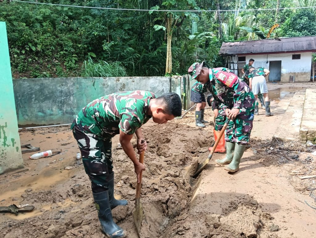Kegiatan gotong royong tersebut dilaksanakan dalam rangka membersihkan material sisa banjir yang mengendap di area pekarangan masjid. Selain itu, Babinsa bersama personel TNI dan warga juga membantu perbaikan WC masjid yang mengalami kerusakan akibat terjangan banjir.