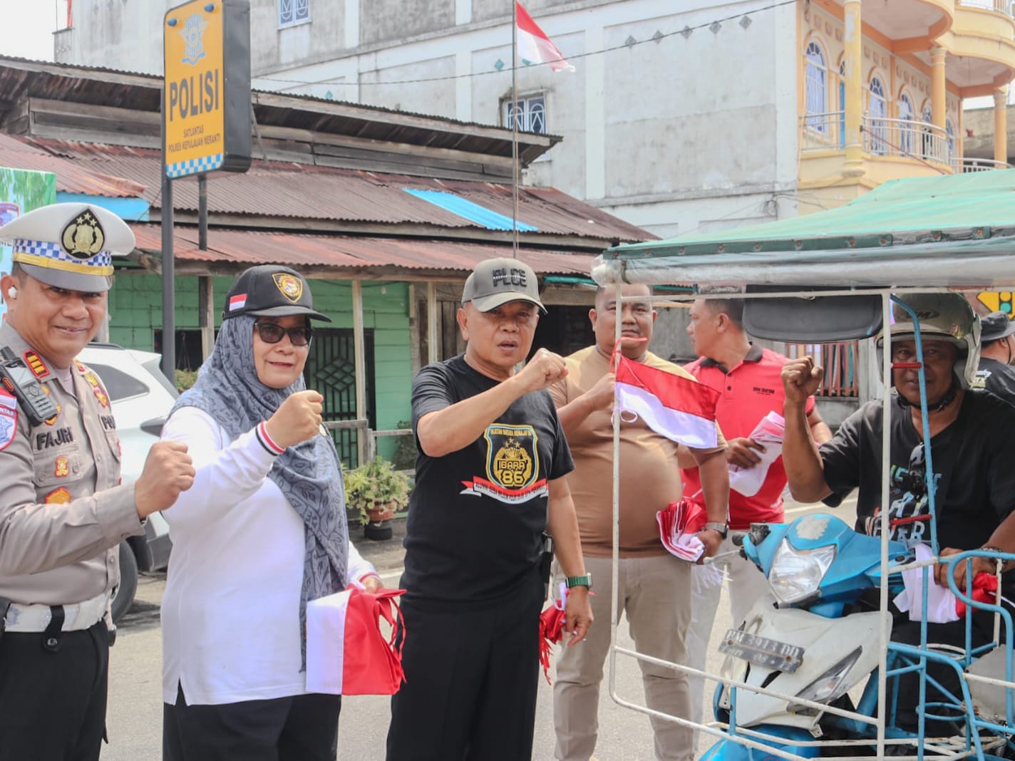 Redaksi24jam. MERANTI – Menjelang peringatan Hari Ulang Tahun (HUT) Kemerdekaan Republik Indonesia ke-80, Bupati Kepulauan Meranti, AKBP (Purn) H. Asmar, membagikan bendera Merah Putih kepada para pengendara sepeda motor yang melintas di Jalan Merdeka, Selatpanjang, Sabtu (16/8/2025).