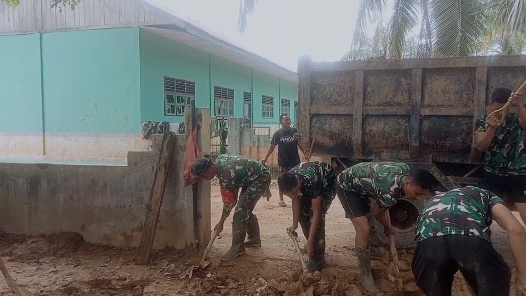 Tapteng-Babinsa Koramil 03/PANDAN Praka Candra Winata Naiborhu bersama personil YonTP 905/TS dan para guru bergotong royong membersihkan lumpur dan kotoran yang menumpuk dihalaman sekolah.