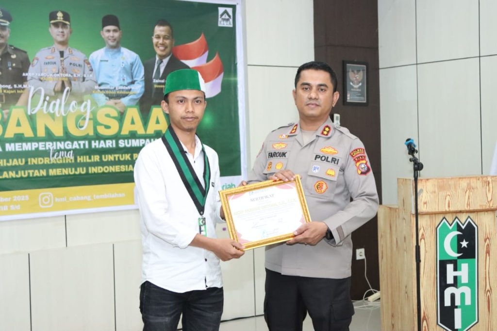 Sementara itu, Kapolres Indragiri Hilir AKBP Farouk Oktora menyampaikan materi mengenai Green Policing dan peran pemuda dalam menjaga nilai-nilai kebangsaan. Ia menekankan bahwa alam adalah titipan bagi generasi mendatang, sehingga masyarakat perlu mengubah pola pikir dalam menjaga kelestarian lingkungan.