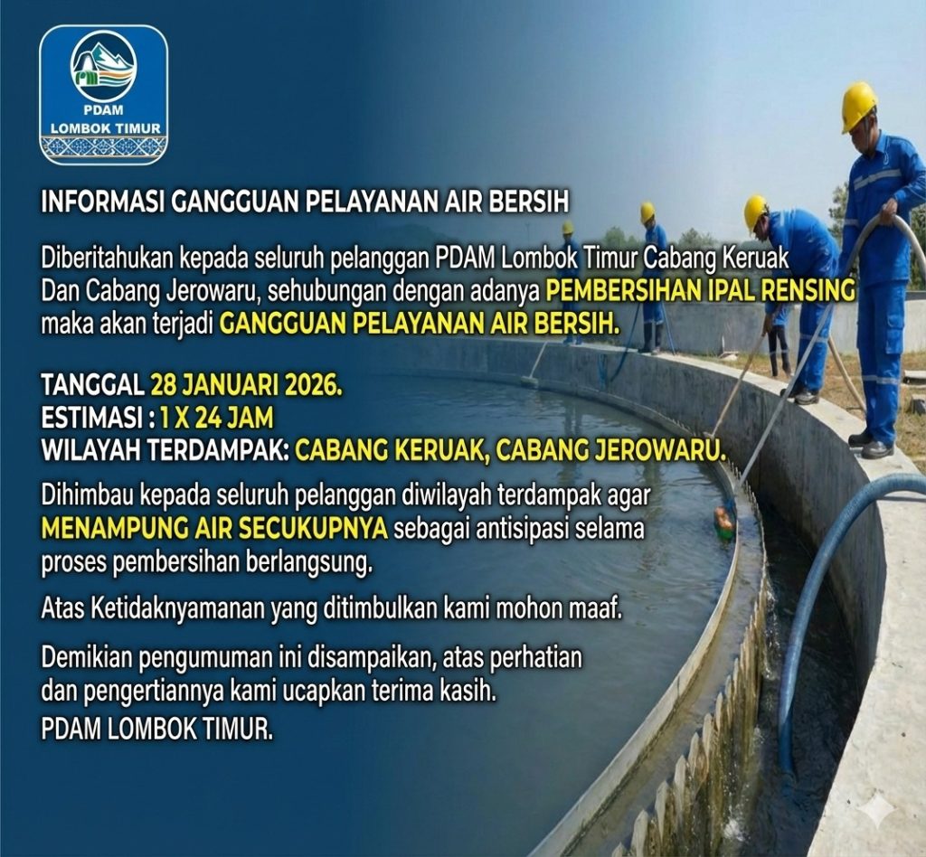 Redaksi24jam.com, Lombok Timur: PDAM Lombok Timur mengumumkan adanya gangguan sementara pelayanan air minum bersih di wilayah Cabang Keruak dan Cabang Jerowaru akibat pembersihan IPAL Rensing, Rabu (28/1/2026).
