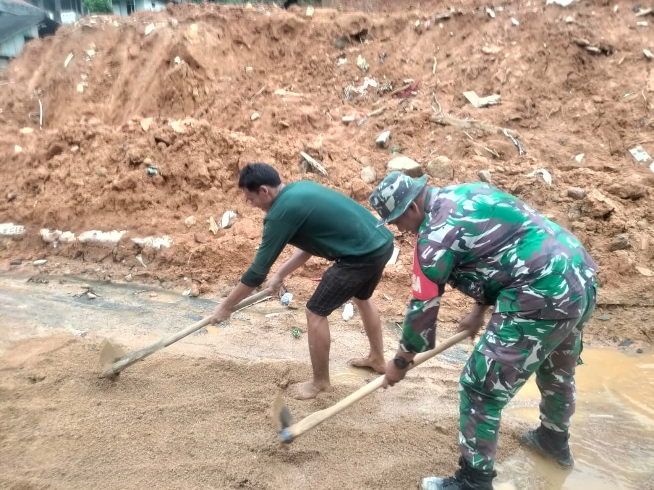 Tukka-Babinsa Koramil 03/Pandan Kodim 0211/TT, Serda Rio Jasman, melaksanakan kegiatan pengamanan pembersihan jalan yang menghubungkan Kelurahan Hutanabolon dengan Kel,Tukka Kec Tukka Kab Tapanuli Tengah pasca bencana banjir (31-12-2025)