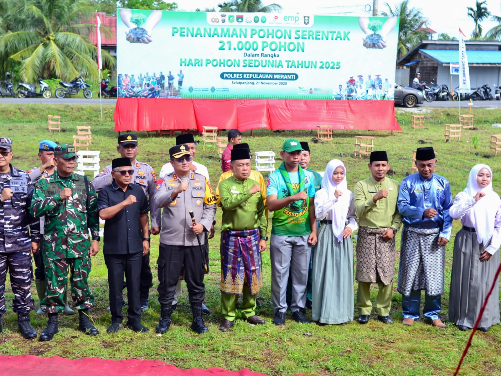 Redaksi24jam. Meranti,- Polres Kepulauan Meranti Gelar Penanaman Pohon Serentak 21.000 Dalam Rangka Hari Pohon Nasional tahun 2025 yang pimpin langsung oleh Bupati Kepulauan Meranti AKBP (Purn) H.Asmar dan Kapolres Kepulauan Meranti AKBP Aldi Alfa Faroqi, S.I.K., M.H.bersama jajaran Forkopimda Kanor Perpustakaan Jalan Perumbi Kota Selatpanjang Jumat (21/11/2025) Pagi.