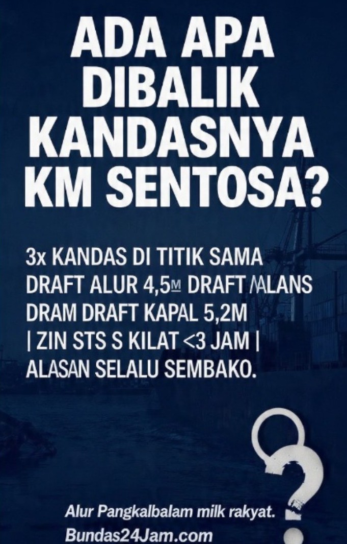 Padahal, data syahbandar menunjukkan draft alur maksimal hanya 4,5meter saat surut terendah, sementara draft KM Sentosa dalam kondisi muatan penuh mencapai 5,2 meter. “Ini bukan pertama kali kapal kandas di alur Pangkalbalam. Polanya sama, izinnya kilat, alasannya selalu sembako.