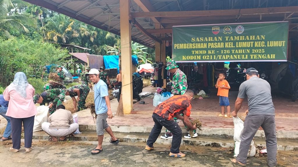 Personel TNI- POLRI,ORMAS dan masyarakat yang tergabung dalam Satuan Tugas (Satgas) TMMD 126 Kodim 0211/TT bersama warga sekitar, melaksanakan kegiatan bersih-bersih di area Pasar Tradisional desa Lumut Kecamatan Lumut Minggu (12/10/2025).